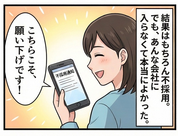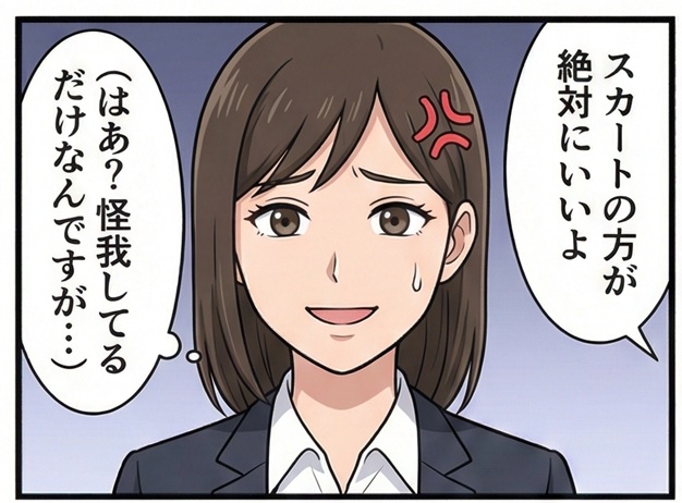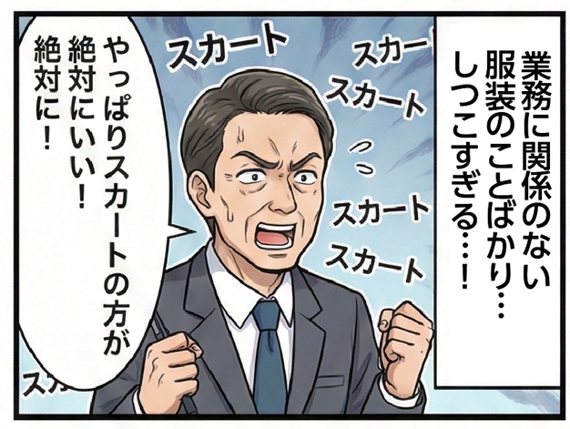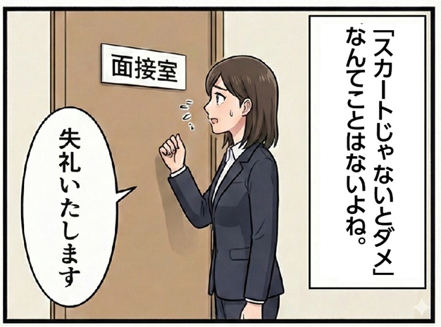 スカートかどうかを異様に気にする面接官は普通に考えて気持ち悪いだろう。なんでそんな人が採用担当をやっているのだろうか……。※マンガの制作にはAIを使用しています。