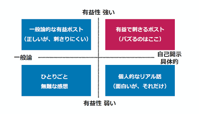 下図分類の通り、「誰かの役に立つ有益性の高い情報」であるとともに、自分ごととして「自己開示がある」ツイートじゃないと見てもらえません。一般論かつ正論、納得感はあるといった内容では、共感は起こらないのです。
