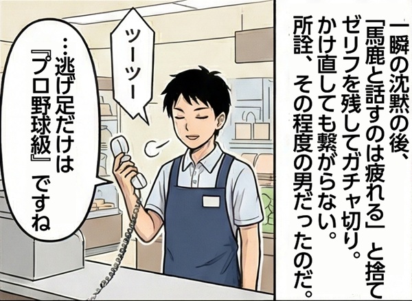 一応、クレーマーを撃退できた男性。こうした人物は何度も電話をかけてくる可能性がある。ほかの店員も毅然とした対応ができていればいいのだが……。※マンガの制作にはAI(Gemini)を使用しています。