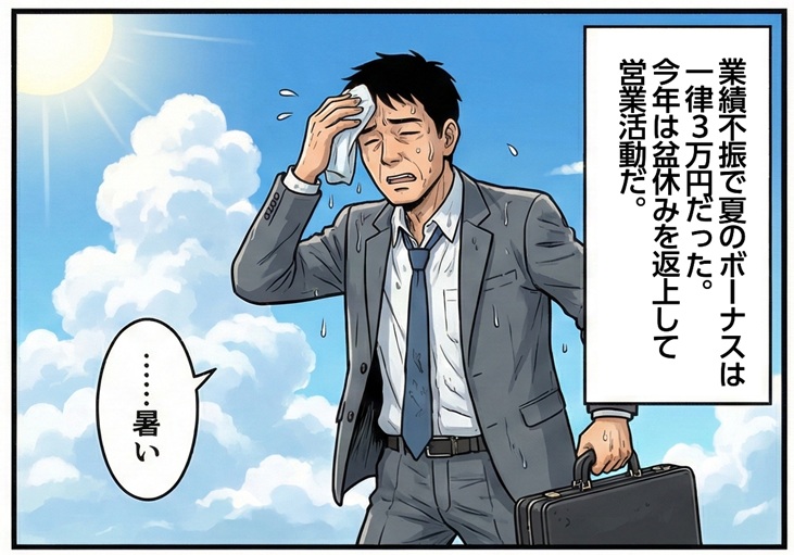 【読者のエピソードをマンガ化!】今回は営業職の50代男性から寄せられたエピソードを紹介。ボーナスが「一律3万円」でも、休み返上で働いていた男性。そんな中、営業で高級旅館に行くと……。
