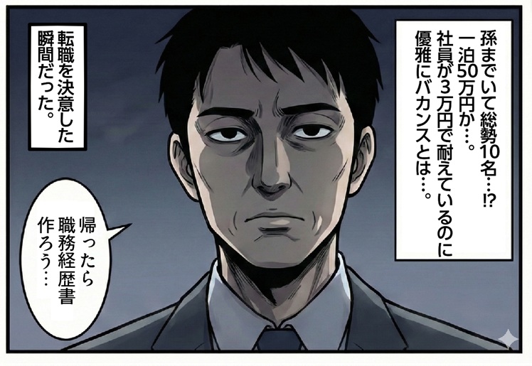 社長のバカンス満喫ぶりを見た男性は「この人は一体何を考えているのか」と絶望。即行で転職を決意したとのことだった。※マンガの制作にはAI(Gemini)を使用しています。