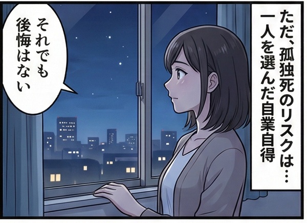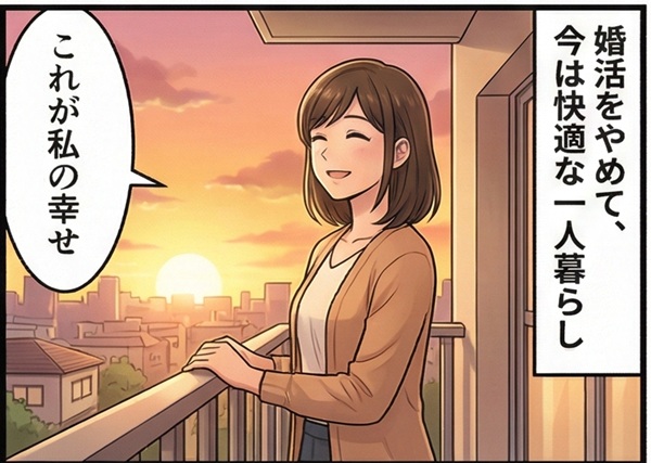 独身でも快適に暮らし、満足している女性。ただ、世の中のほとんどの人は、そこまで上手く事は進まないだろう。羨ましいと感じる人も多いのでは。※マンガの制作にはAI(Gemini)を使用しています。
